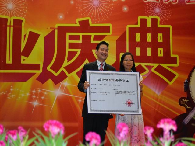 廣西保監(jiān)局易細純副局長向王林總頒發(fā)保險業(yè)務(wù)經(jīng)營許可證