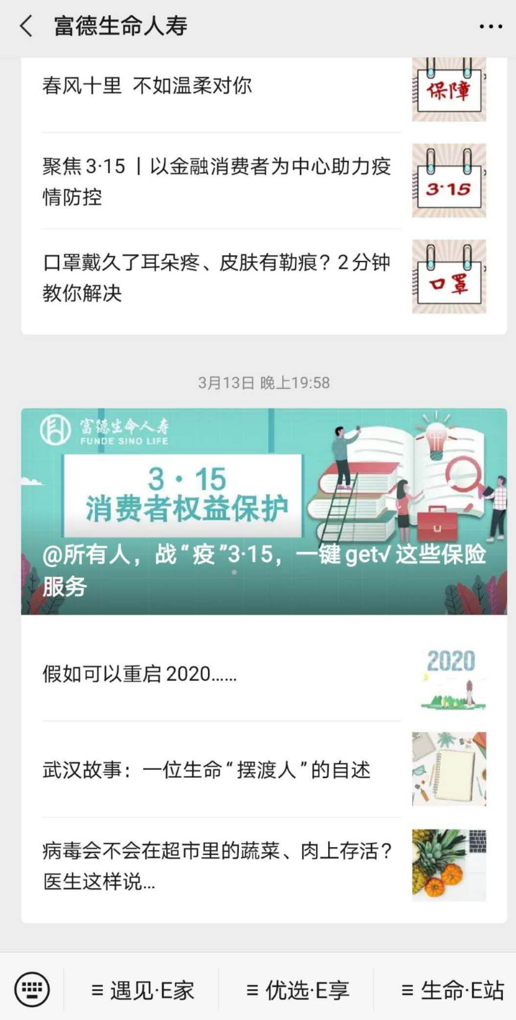 2020年“3·15”消費(fèi)者權(quán)益保護(hù)教育宣傳周期間,富德生命人壽結(jié)合疫情防控要求,重點(diǎn)突出線上教育宣傳形式,深入開展“以金融消費(fèi)者為中心,助力疫情防控”的主題宣傳活動??偡止境浞掷镁€上渠道,通過小視頻、小漫畫、有獎(jiǎng)問答活動、長圖文、保險(xiǎn)課堂專題等,積極開展形式多樣的保險(xiǎn)宣傳教育,引導(dǎo)消費(fèi)者進(jìn)一步提升風(fēng)險(xiǎn)防范意識、依法維權(quán)意識,把消費(fèi)者權(quán)益保護(hù)工作落到實(shí)處。