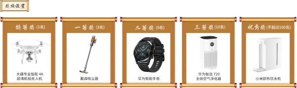 10月21日至11月5日期間,兩位特約專家評委將對入圍決賽的作品進行評分,根據(jù)綜合評分排名,大賽將最終誕生特等獎1名、一等獎3名、二等獎6名、三等獎10名、優(yōu)秀獎最多100名,并送出豐厚獎品。