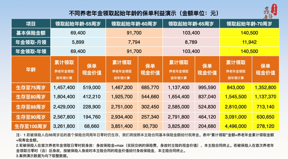 首先是方案靈活,“鑫禧年年”可提供兩種保障方案任選,方案一的鑫禧“精彩養(yǎng)老計(jì)劃”,即選擇被保險(xiǎn)人身故時(shí)按主險(xiǎn)合同的現(xiàn)金價(jià)值給付身故保險(xiǎn)金的方案,優(yōu)勢(shì)在于在合同有效期內(nèi)被保險(xiǎn)人生存期可領(lǐng)取養(yǎng)老年金、祝壽金的金額相對(duì)較多,主打提前規(guī)劃和品質(zhì)養(yǎng)老,特征是高領(lǐng)取,側(cè)重于保障自身的養(yǎng)老品質(zhì);方案二的鑫禧“傳世養(yǎng)老計(jì)劃”,即選擇本主險(xiǎn)合同實(shí)際交納的保險(xiǎn)費(fèi)與被保險(xiǎn)人身故時(shí)按本主險(xiǎn)合同的現(xiàn)金價(jià)值二者的較大者給付身故保險(xiǎn)金的方案,特點(diǎn)是相較于方案一的高現(xiàn)價(jià),主打精致養(yǎng)老和財(cái)富傳承,在領(lǐng)取養(yǎng)老年金、祝壽金獲得老年生活資金支持的同時(shí),身故后可以留給后代更多資金,側(cè)重于財(cái)富傳承。